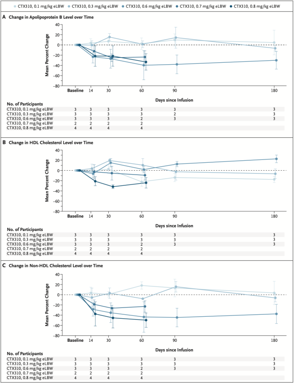 Méthode : L'étude CTX310, un essai de phase 1 à dose unique croissante, a évalué une thérapie d'édition génique CRISPR-Cas9 ciblant l'ANGPTL3. 15 participants (hypercholestérolémie familiale, hypertriglycéridémie ou dyslipidémie mixte) ont reçu une dose IV de 0,1 à 0,8 mg/kg.