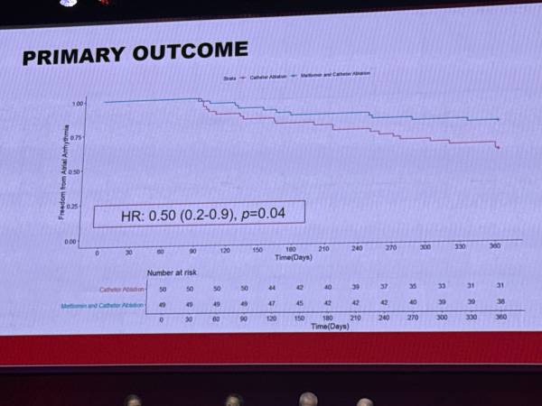 Méthode : essai randomisé, ouvert, incluant des patients en surpoids ou obèses sans diabète, subissant une ablation par cathéter pour FA persistante ou paroxystique. La metformine était titrée avant l'ablation, le groupe témoin recevant des conseils de mode de vie. Le critère principal était la récidive d'arythmie auriculaire (>30s) entre 3 et 12 mois.