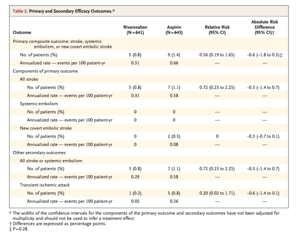 L'essai OCEAN, une étude randomisée internationale en ouvert, a évalué la poursuite de l'anticoagulation (rivaroxaban 15 mg) versus l'aspirine chez des patients un an après une ablation réussie de la FA (CHADS-VASc moyen 2,2). L'objectif était de déterminer la supériorité de l'anticoagulation pour un critère composite d'AVC, d'embolie systémique ou d'AVC silencieux . L'essai a été arrêté prématurément pour futilité . Les résultats ont révélé un taux d'événements primaires très faible dans les deux groupes (0,3 % pour le rivaroxaban, 0,66 % pour l'aspirine), sans différence significative . Les saignements majeurs étaient similaires, mais le rivaroxaban a augmenté les saignements non majeurs cliniquement pertinents . En conclusion, après une ablation réussie de la FA chez des patients à risque faible à modéré, le risque d'AVC est très faible et la poursuite de l'anticoagulation n'a pas démontré de supériorité par rapport à l'aspirine .