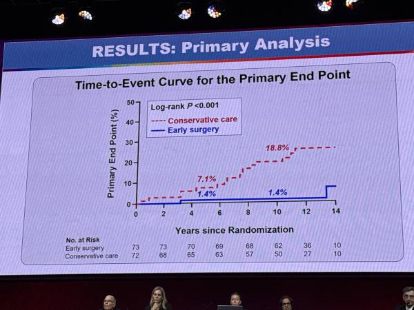 Les résultats finaux sur 10 ans ont montré une réduction significative de la mortalité opératoire ou cardiovasculaire dans le groupe chirurgie précoce (2 patients) par rapport au groupe conservateur (17 patients) (HR 0,10, p=0,002) . La mortalité toutes causes était également plus faible (11 vs 23 décès) . 82% des patients du groupe conservateur ont finalement été opérés.