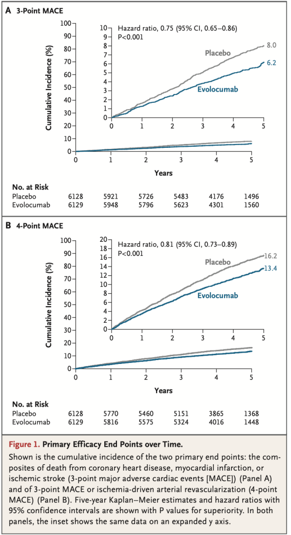 Résultats : L'Evolocumab a réduit le LDL-cholestérol à une médiane de 45 mg/dL (réduction de 55%). Il a entraîné une réduction de 25% du risque relatif de MACE à 3 points et de 19% pour le MACE à 4 points (p < 0,0001).